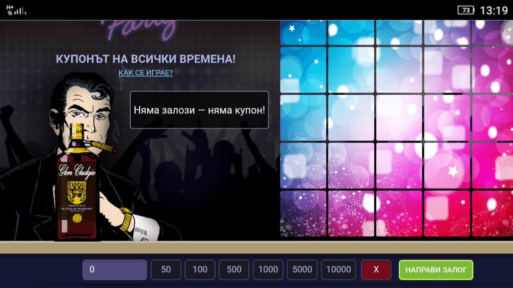 На полето за купон има 25 квадратчета. Между тях са скрити символи, които са характерни за купона, но те носят печалби. Това са 12 печеливши квадратчета (x2): чаши с коктейли, шишета уиски, цигари, сексапилни момичета.